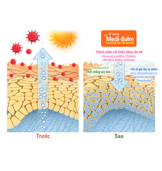 Hỗ trợ phục hồi da về trạng thái bình thường thông qua cải thiện hàng rào bảo vệ da cơ bản, không chỉ đơn thuần tái tạo da bị tổn thương. Việc sử dụng weMedi-Balm thường xuyên giúp sắp xếp lại các tế bào sừng theo cấu trúc ổn định với lớp lipid gian bào được xếp lớp trật tự, từ đó giúp da giữ đủ độ ẩm và bảo vệ da trước các tác nhân tác động từ bên ngoài.